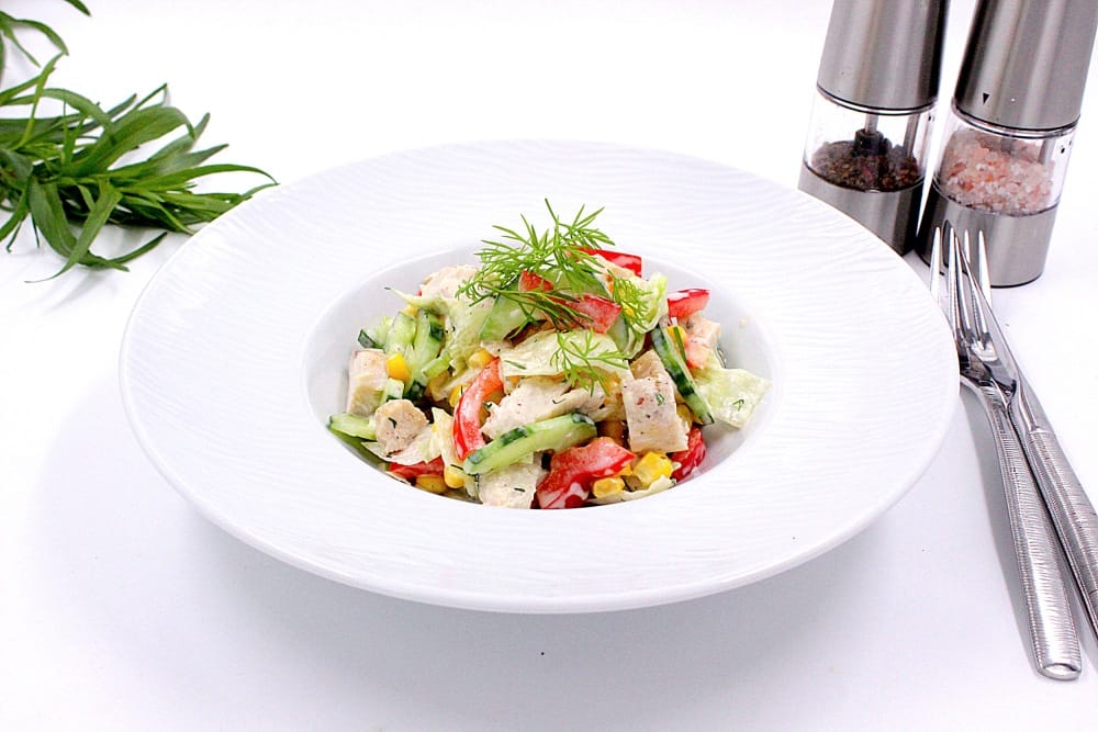 - That’s it, a simple salad with chicken breast is ready. It’s really simple: fry the chicken, chop the vegetables, mix – and it’s ready. It’s good for lunch, dinner, and a snack. Bon appetit and a delicious salad to everyone!