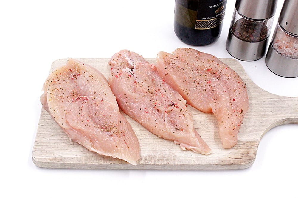 - Cut the chicken breast lengthwise and open it like a book so that the layers are not thick – no more than 2 cm. Salt and pepper. Let it marinate a little.