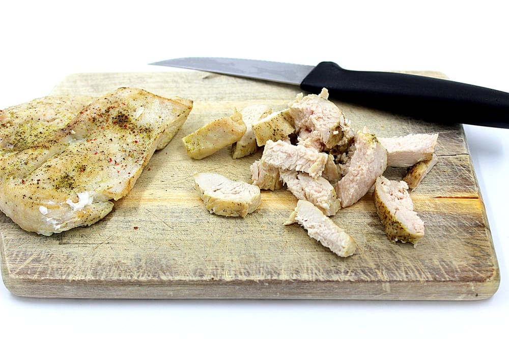 - Heat a frying pan, add a spoon of olive oil. Fry the chicken on both sides for 2-3 minutes over medium heat. Then cool and cut into small pieces.