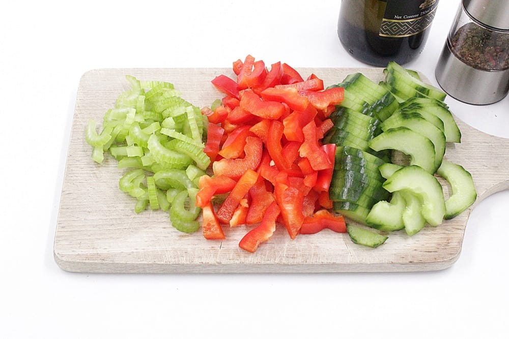 - Cut the cucumber, celery, and bell pepper into thin strips.
