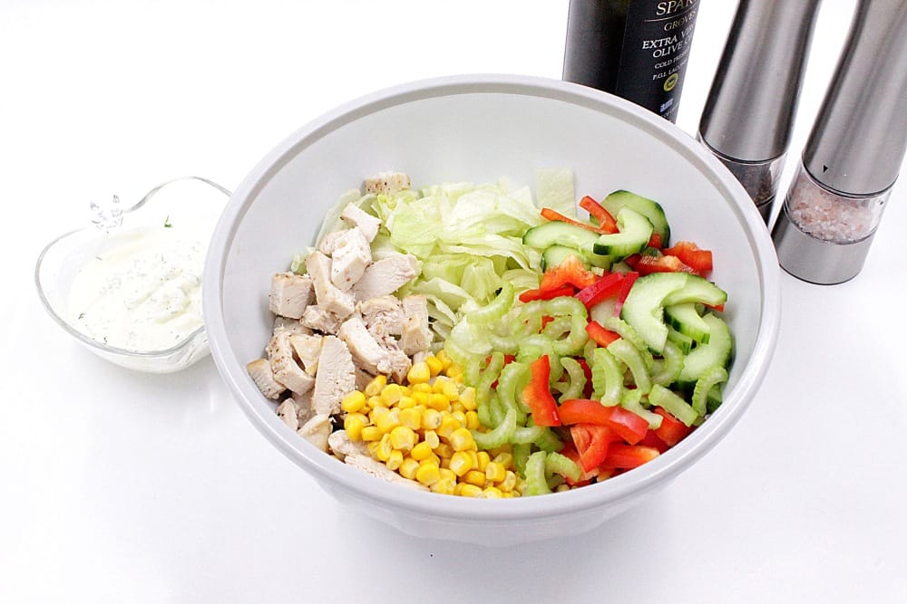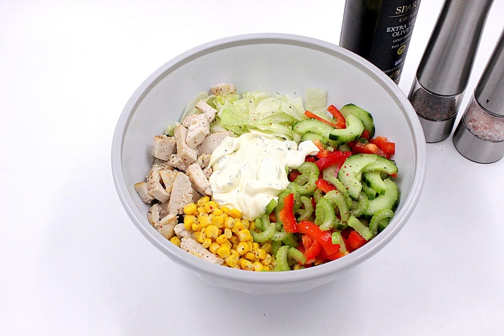 - Place all chopped vegetables, corn, and chicken in a bowl.